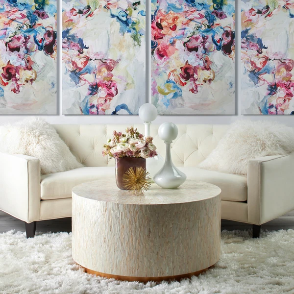 Our Alexandria Mosaic Coffee Table is the prettiest central perch for entertaining. Mother-of-pearl mingles with a cool ivory finish, creating a light-catching mosaic. A go-to golden leaf base elevates our glam design.
