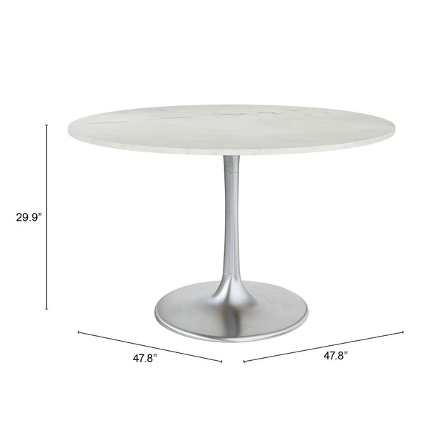 A modern dining table designed with a white marble top featuring unique grey veining and a tulip shaped base in a rich silver finish.