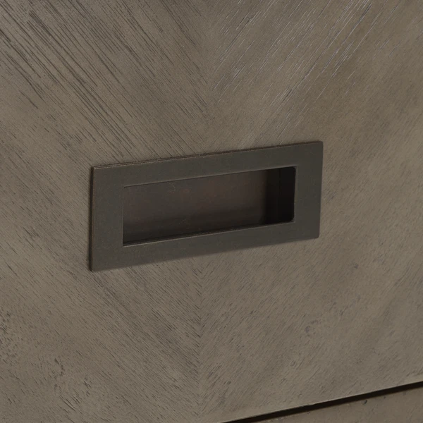 Mid Century chic meets contemporary class in this sophisticated Anson 2 Drawer Nightstand. The herringbone inspired pattern on Anson’s solid wood frame in a light grey finish with an acacia veneer makes for a look that’s always in vogue. Subtle bronze pulls add a soft, glamorous touch.
