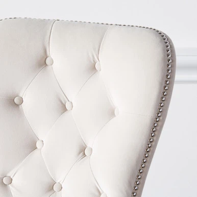 With its gentle curving silhouette, our sophisticated Charlotte Dining Chair effortlessly elevates the style of any room. Plush upholstery and hand-applied nail head details atop wooden legs make our Charlotte Dining Chair both refined and versatile. A pull ring matching the nailheads adorns the back of each chair. Shown in Bella Velvet Pearl with bright nickel nailheads.