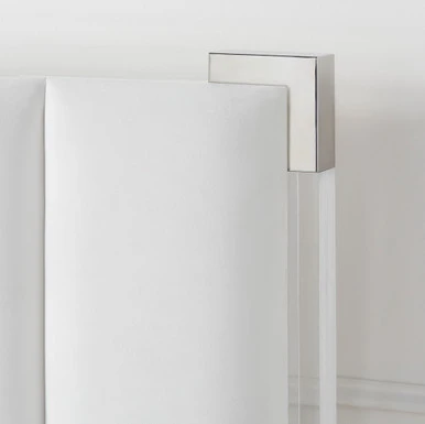Channel tufting pared with an acrylic frame gives our Emory Bed a modern feel with glamourous touches. Accented with stainless steel corners and feet. Shown in Bella Velvet Grey.