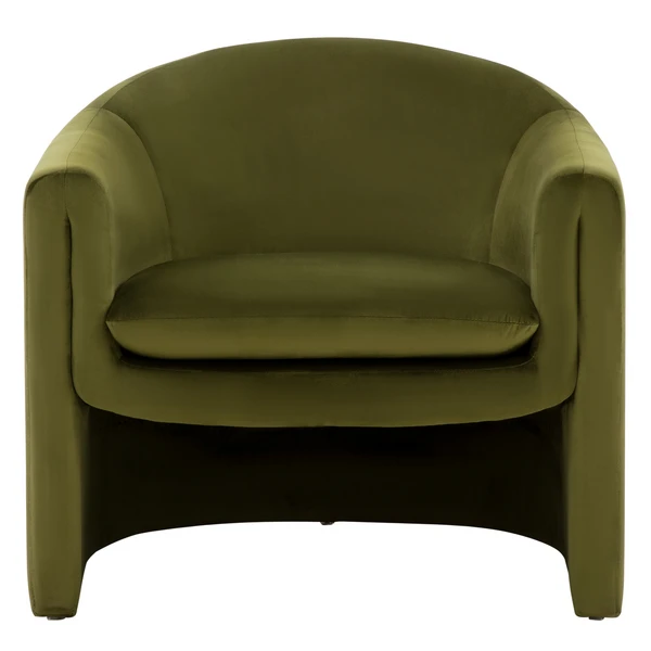 With its plush velvet upholstery and modern, sculptural silhouette, this barrel-back accent chair makes a standout addition to any space.