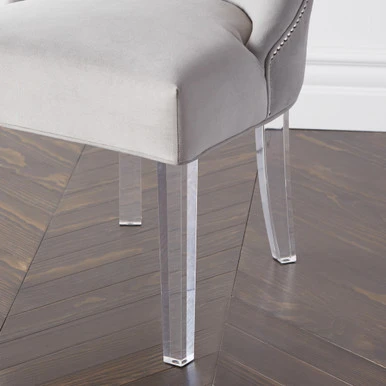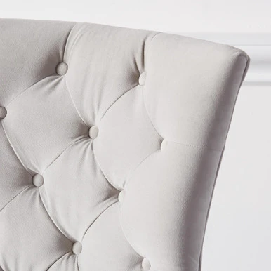 A relaxed pitch and low, sheltering arms give this chair an understated elegance, and comfort that encourages leisurely dining. Shown in Bella Velvet Dove with bright nickel nailheads.
