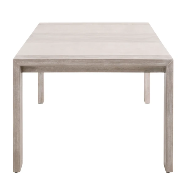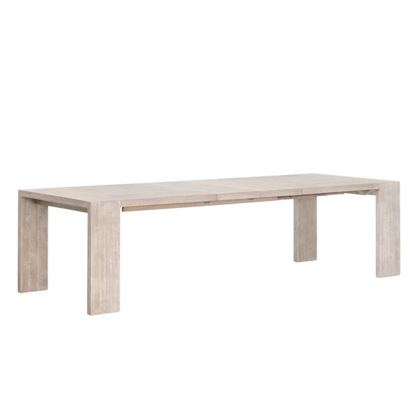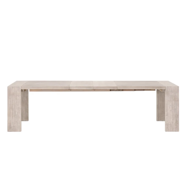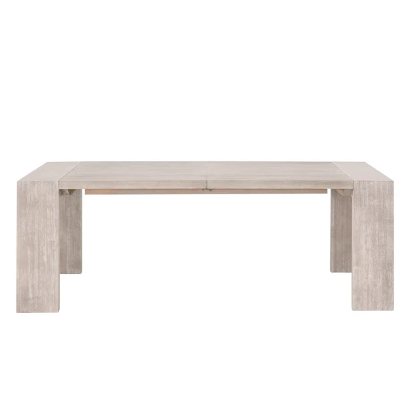 This extension dining table features sleek and simple silhouette. Crafted with acacia wood with natural gray undertones and comes with two removable extension leaves. Comfortably seats up to 8 people with both table leaves inserted.
