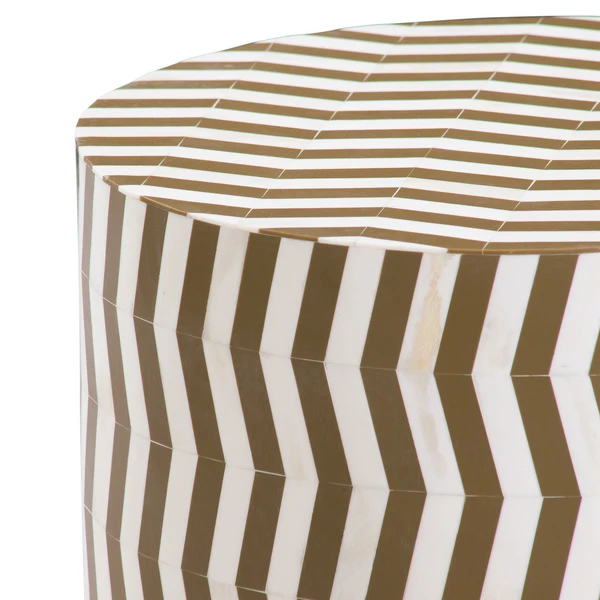 The Seneca Accent Table is a round scatter table with a chevron patterning alternating natural bone and grey resin.