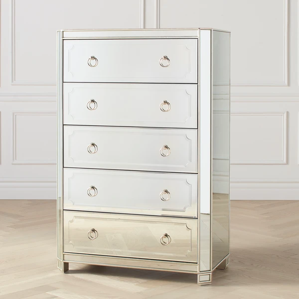 Designed with clean lines and beveled mirror paneling, our Simplicity Collection delivers shimmering style to the bedroom. Hand-applied silver-leaf trim and polished nickel hardware finish off the glamorous look.