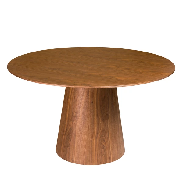 Designed with a walnut veneer finish and sculptural silhouette, this dining table lends cool, contemporary style to the dining room. Assembly required.