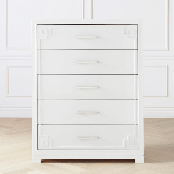 The design of our York Collection harmonizes a distinctive mix of materials, creating a highly stylized design influenced by Greek Key fretwork. Each piece comes with a complete set of both gold and silver finished drawer pulls to suit a variety of décor settings.